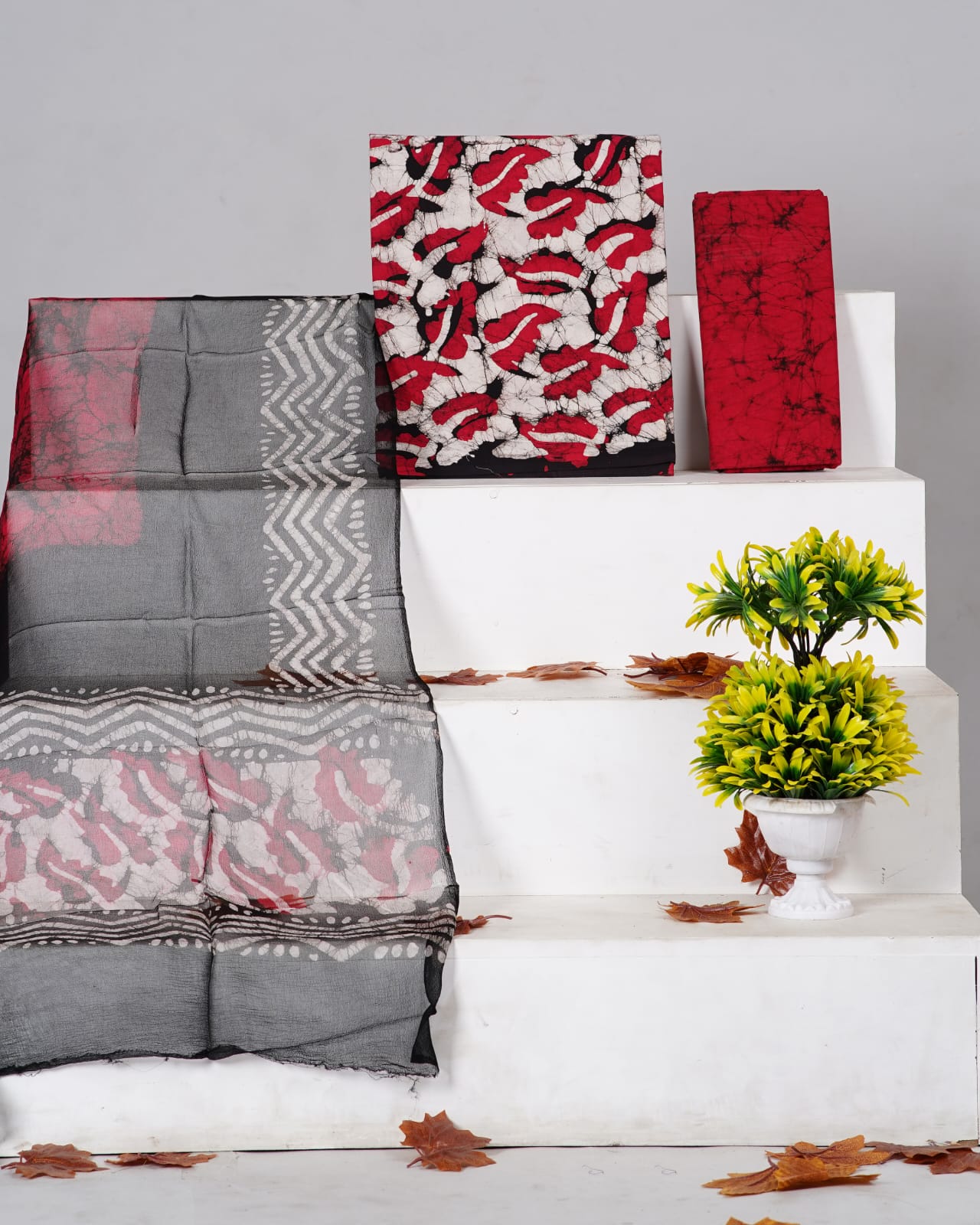 Hand Block Printed Pure Cotton Unstitched Suit With Chiffon Dupatta