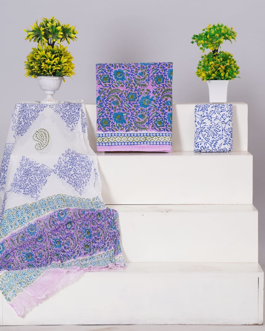 Hand Block Printed Pure Cotton Unstitched Suit With Chiffon Dupatta
