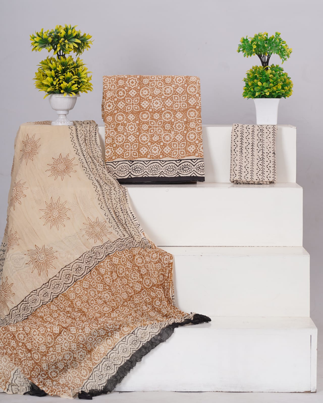 Hand Block Printed Pure Cotton Unstitched Suit With Chiffon Dupatta