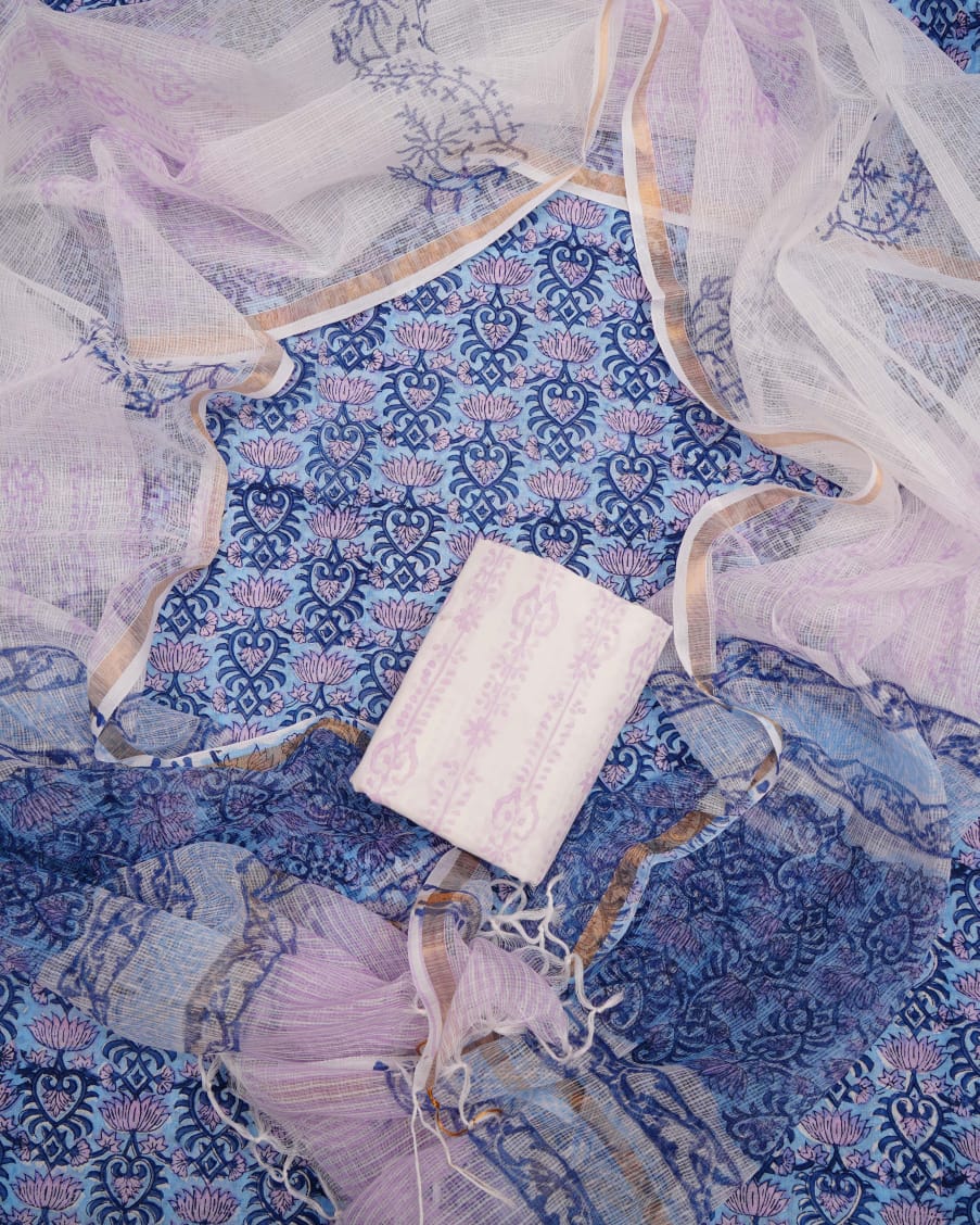 Pure Cotton Unstitched Suit With Pure Kota Doria Dupatta With Jari Border