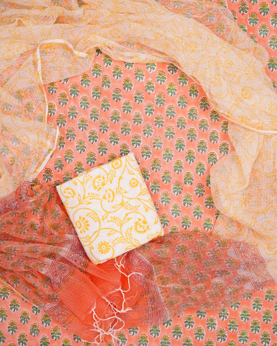 Pure Cotton Unstitched Suit With Pure Kota Doria Dupatta With Jari Border